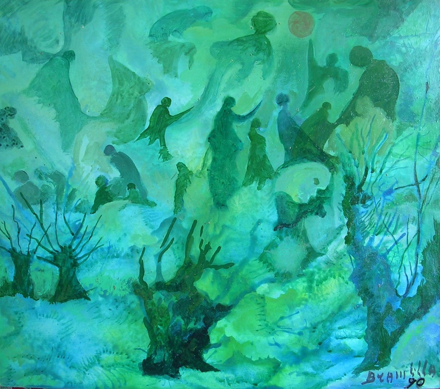Paesaggio su verde di fantasia – acrilico, 1981, 50×70 cm